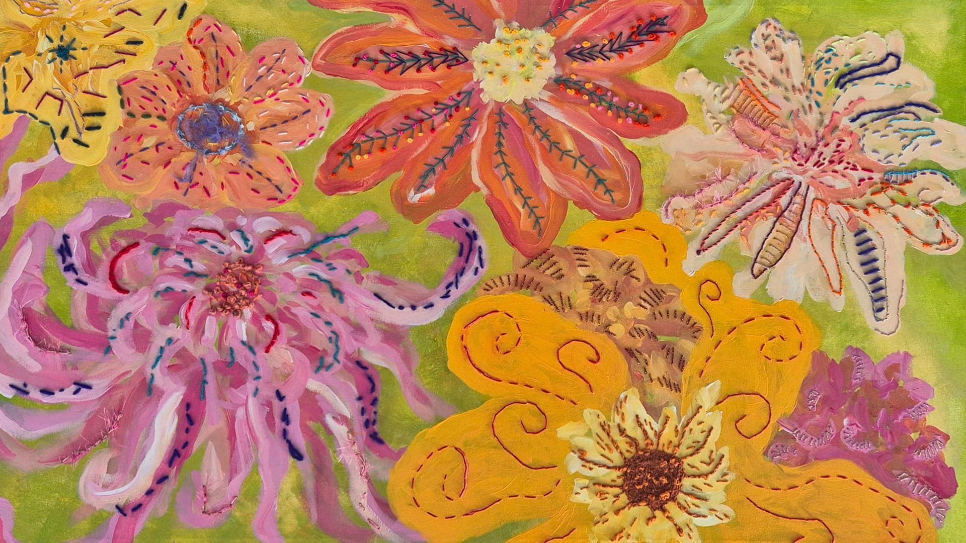 Het werk is gemaakt op een canvas, waarin schildertechniek en borduren zijn gecombineerd tot een kleurrijk geheel.