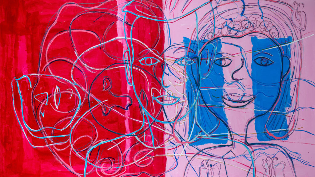 Het werk verbeeldt de verbinding tussen mensen. De tussenruimte tussen de kleurvlakken symboliseert de brug die tussen hen wordt gebouwd. De lijnen vormen niet alleen de personages, maar laten ook zien hoe iedereen met elkaar in contact staat. De kleurvlakken – rood, roze en blauw – zijn tinten die je niet vanzelfsprekend met elkaar zou combineren. Juist daardoor benadrukken ze de kracht van verbinding: contrasten die samenkomen en elkaar versterken.